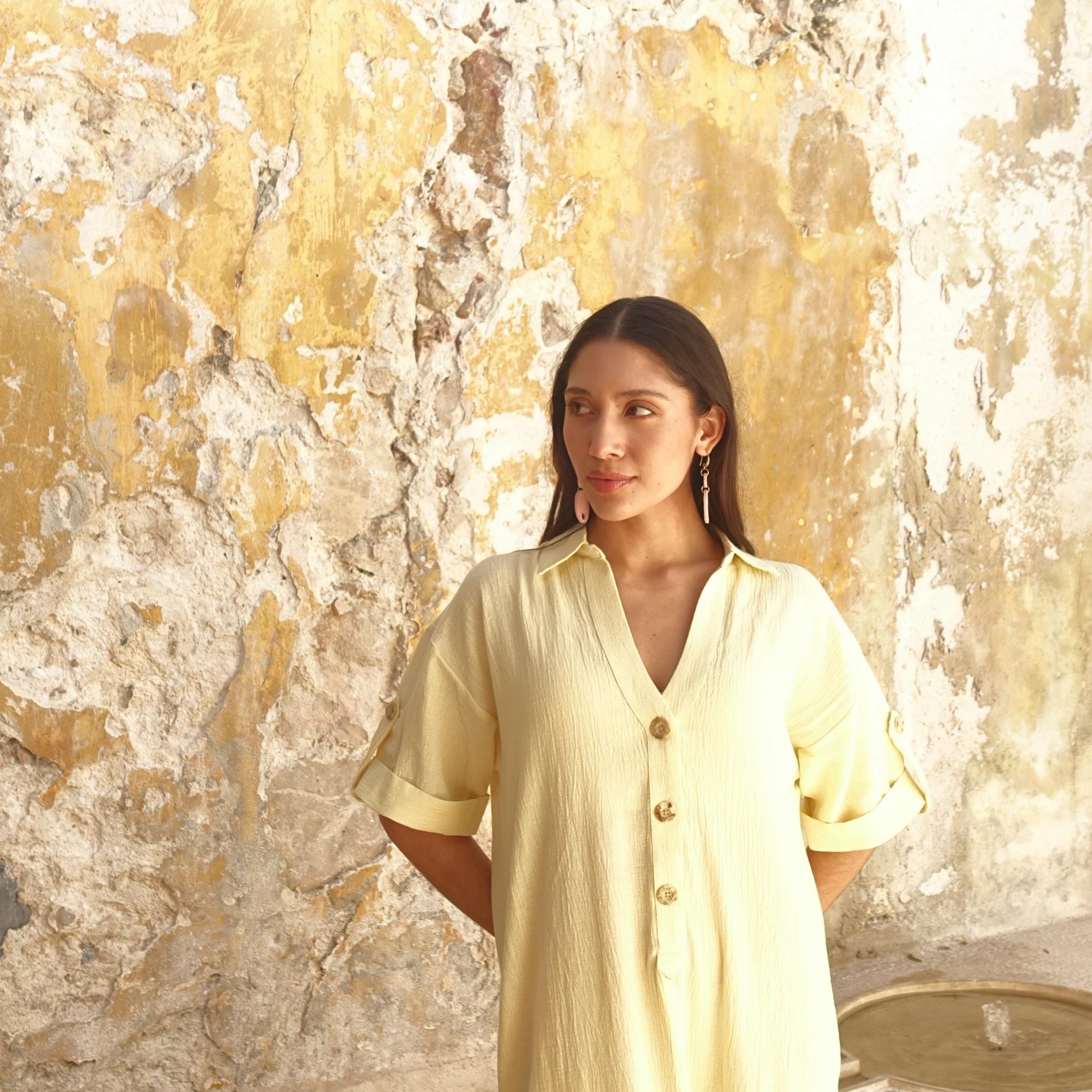 Vestido midi elaborado en manta corrugada con detalle de botones rústicos.