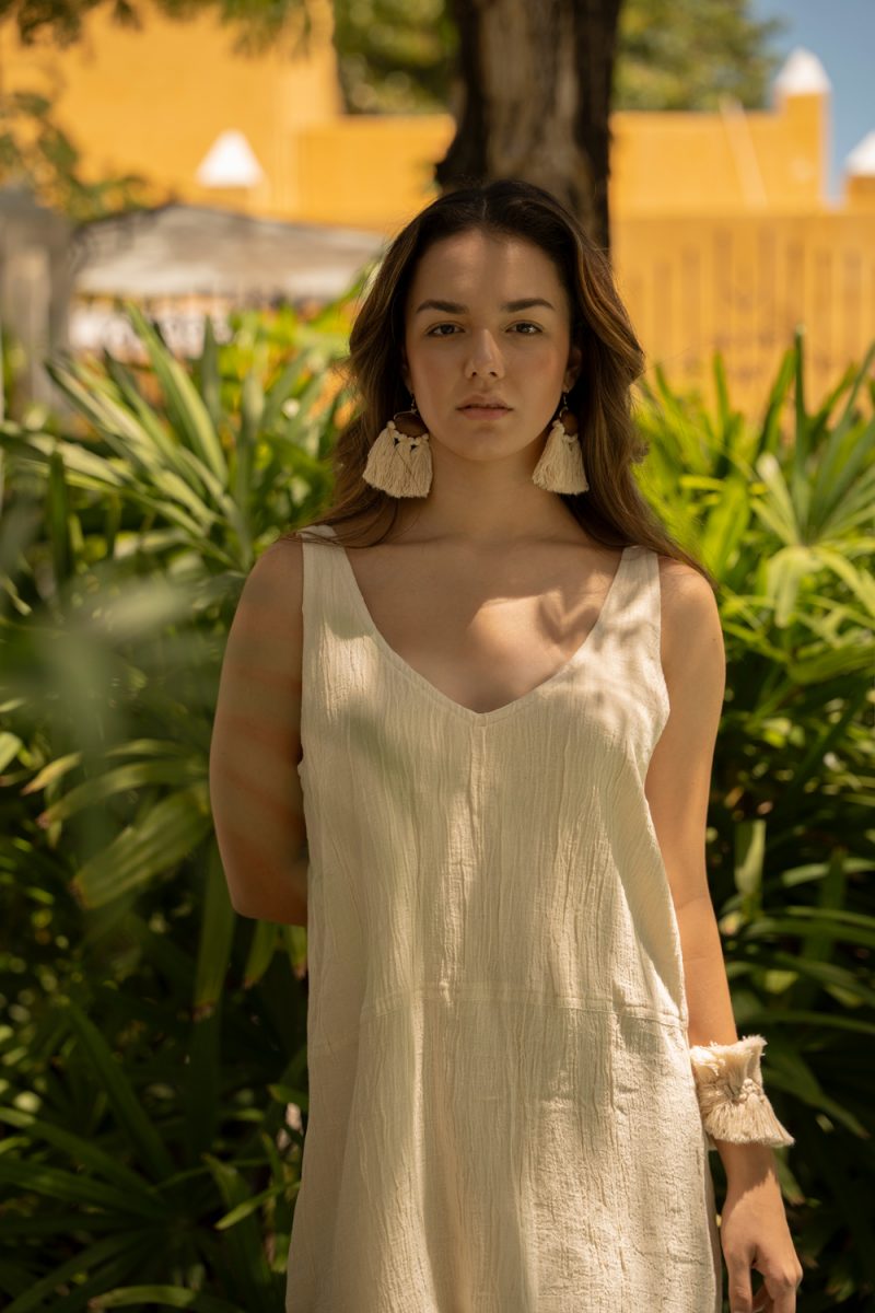 Vestido holgado confeccionado en manta corrugada con doble capa en la falda, ideal para climas cálidos.